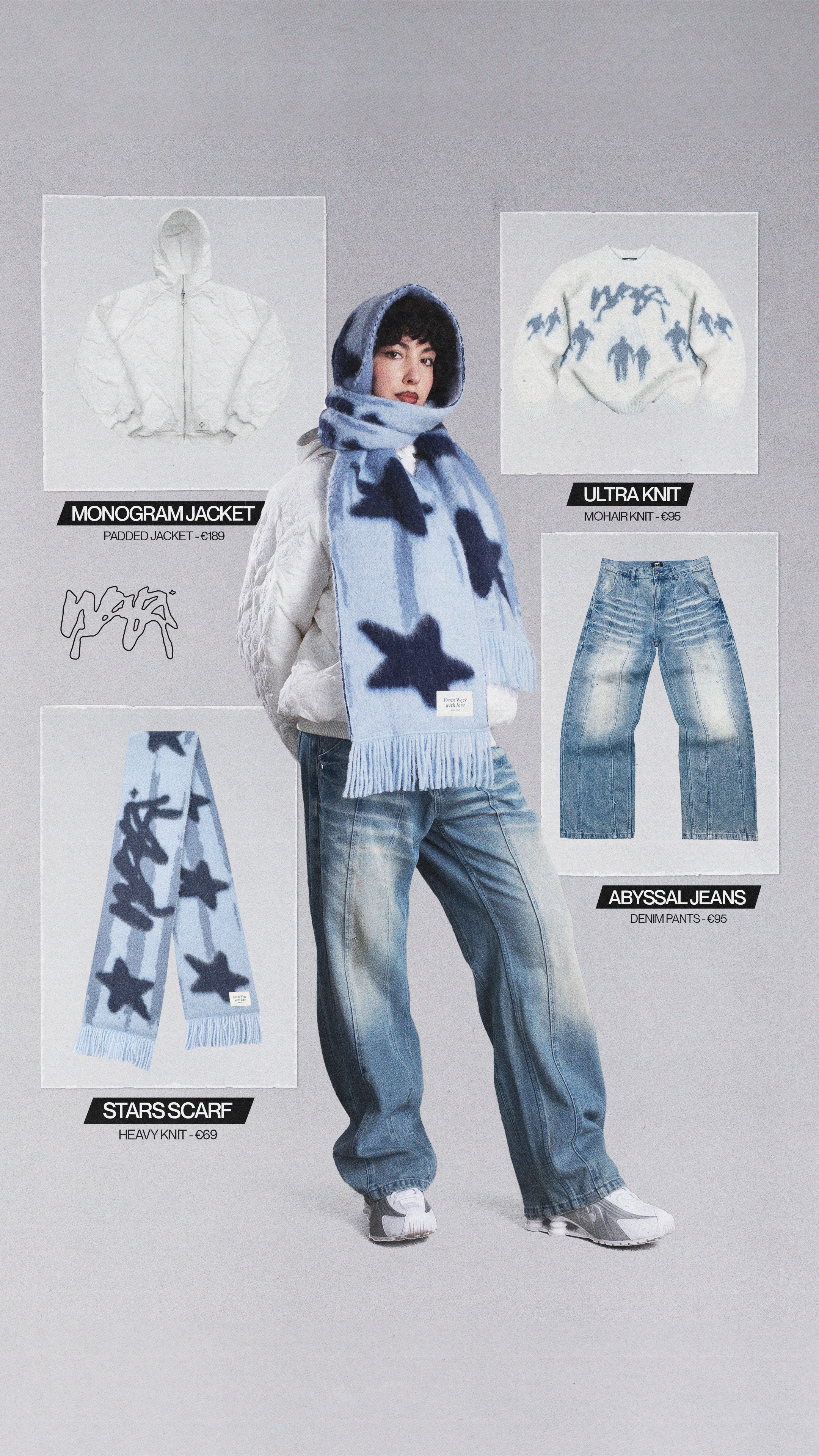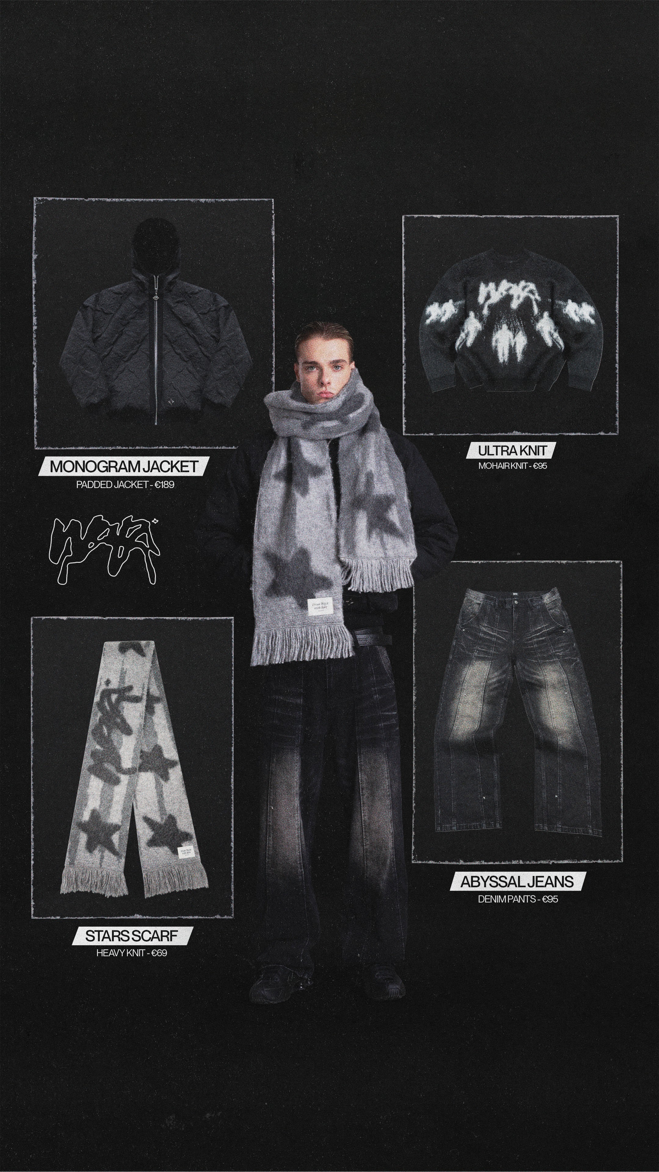 For collection promos, I designed visuals that paired styled looks with clear product callouts. Individual pieces were isolated alongside worn shots, allowing viewers to quickly understand fit, texture, and construction without losing the overall aesthetic.
